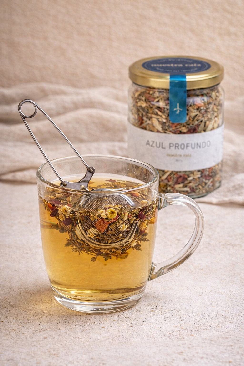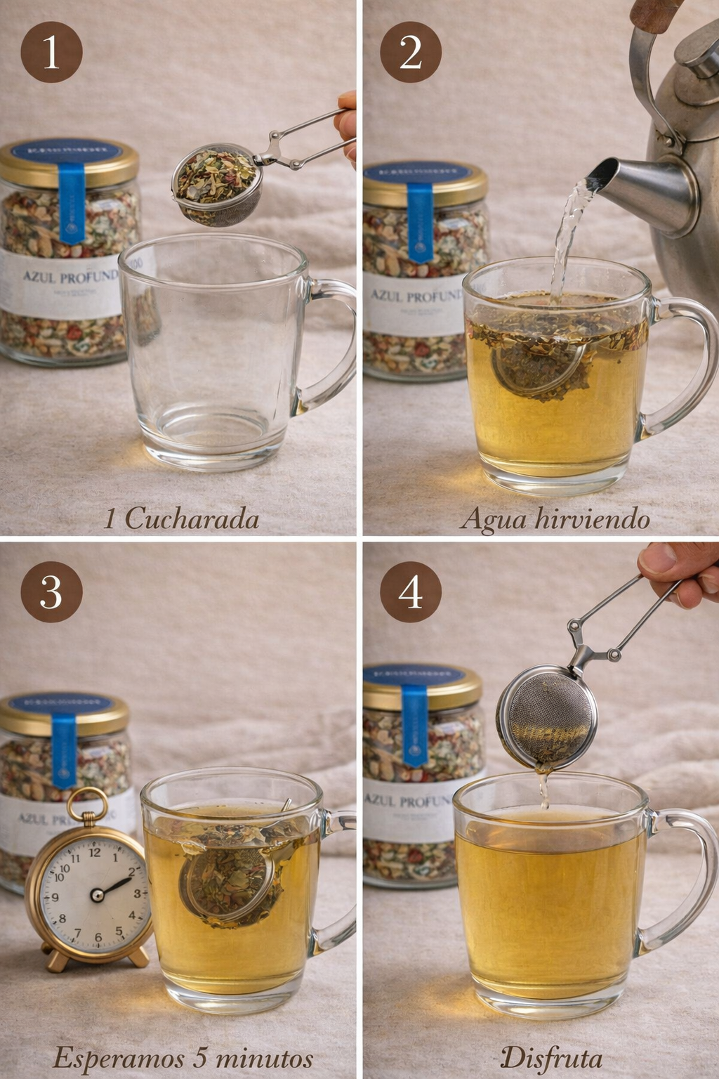 Calienta el agua a 90°C — no hirviendo. Vierte sobre 1 cucharada sopera (3–4g) y deja reposar 6–8 minutos con tapa. El tiempo extra (vs otras tisanas) es importante para que la pasiflora y el zacate limón liberen bien sus propiedades. Cuela y disfruta sola o con un toque de miel de abeja.