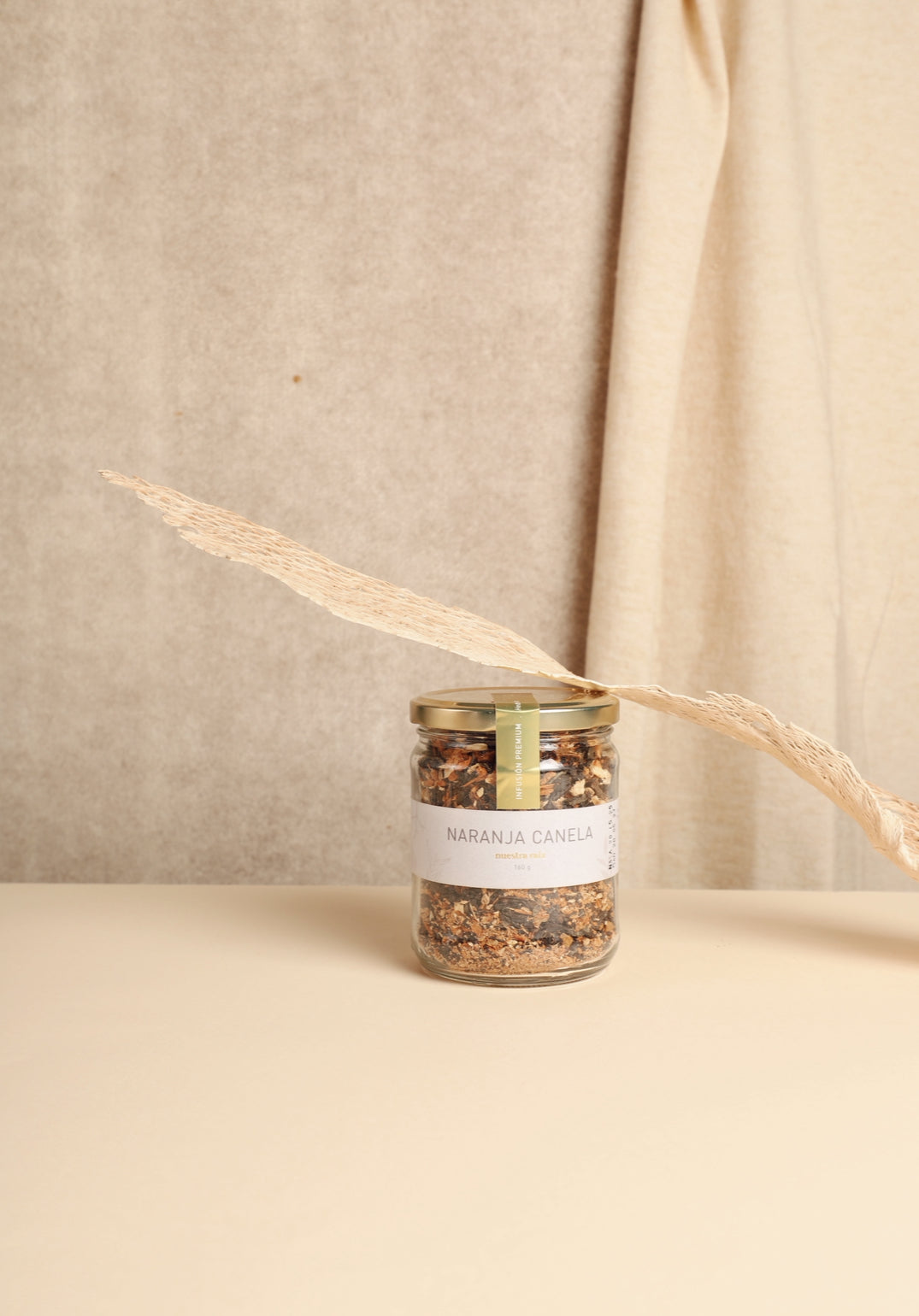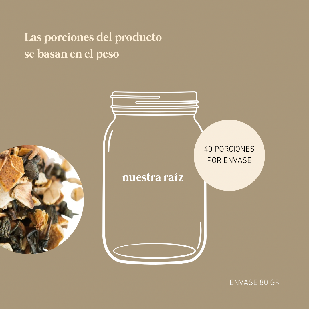 Cáscara de naranja sustentable, té negro orgánico, clavo, jengibre, jazmín y canela de ceylan orgánica.