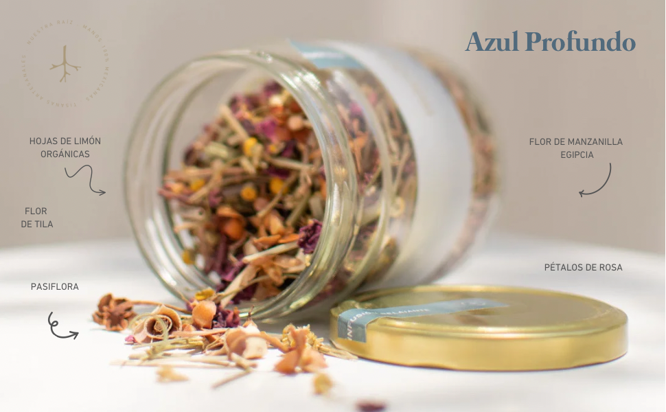 - 1 Infusión premium de Azul Profundo de 80 gramos. Ingredientes: Pasiflora, flor de tila, hojas de limón orgánicas, flor de manzanilla y pétalos de rosa.