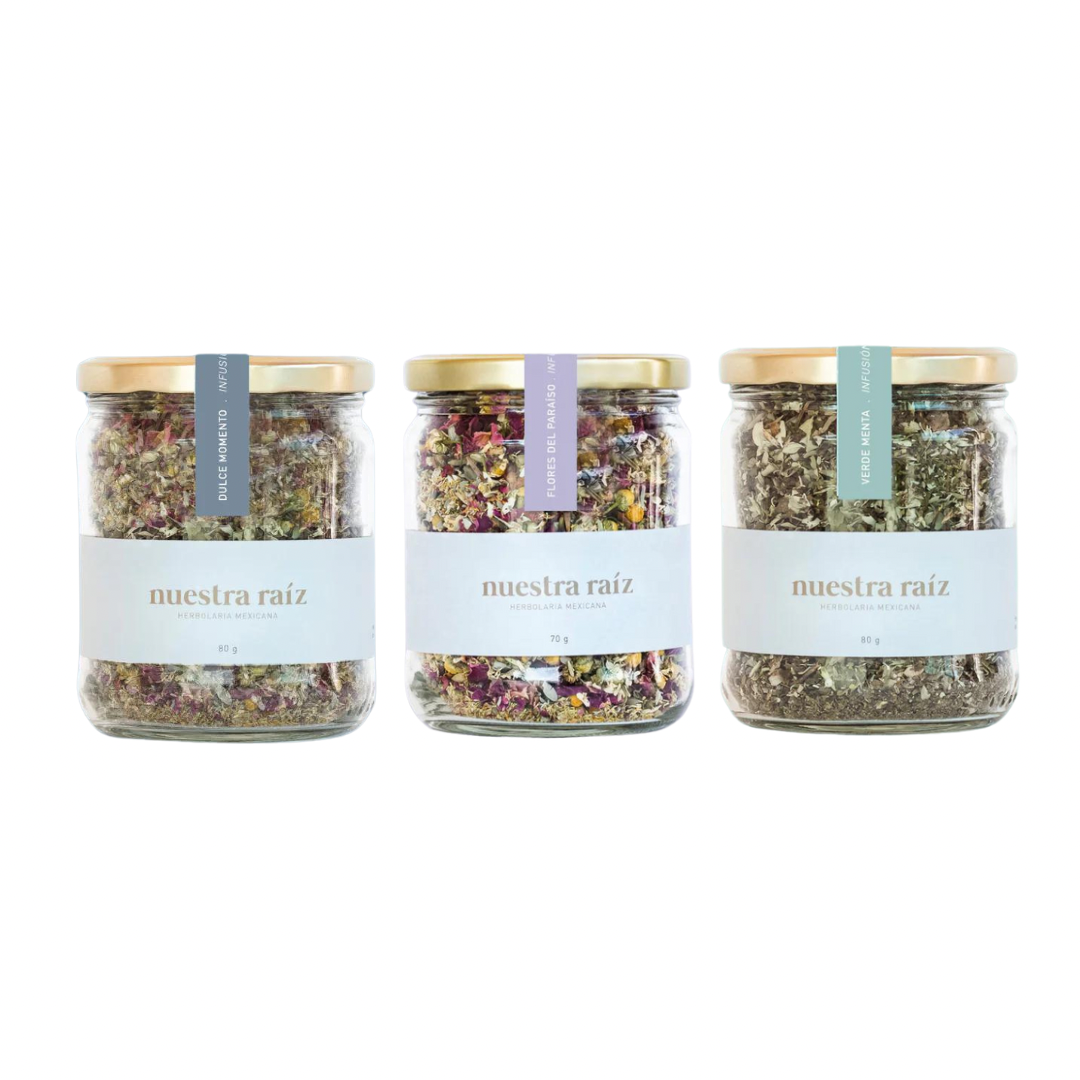 3 Frascos de vidrio, con infusiones de hebra entera, de pequeños productores, comunidades y cooperativas indígenas de nuestro campo mexicano para acercarTé 3 mezclas orgánicas, relajantes, calmantes y perfectas para disfrutar a cualquier hora del día porque no contienen cafeína.