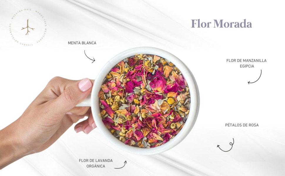 - 1 infusión premium de Flor Morada de 80 gramos. Ingredientes: Pétalos de rosa, flor de lavanda orgánica, menta blanca y flor de manzanilla.