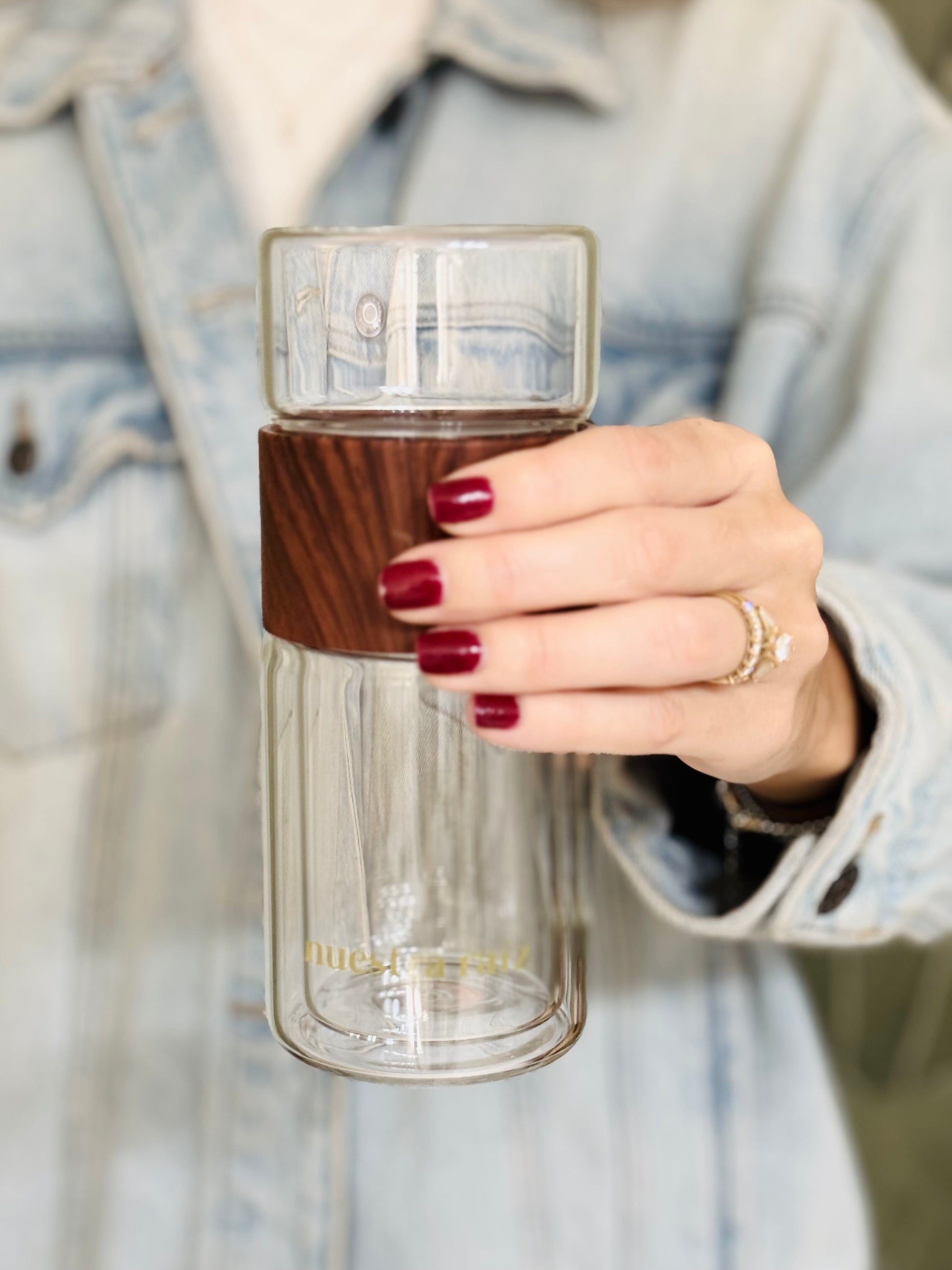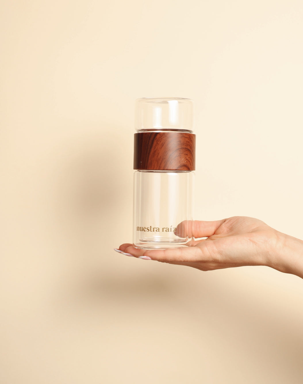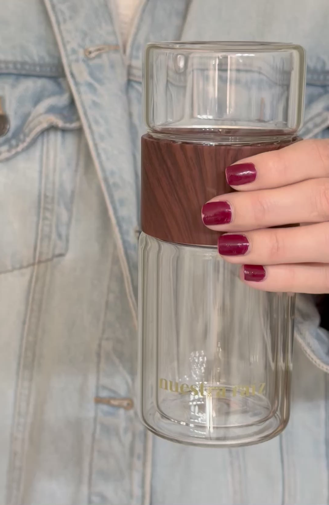 Es un termo con material de vidrio doble pared, aislante para mantener la temperatura del agua e incluye infusor de acero inoxidable incluido y tapa.